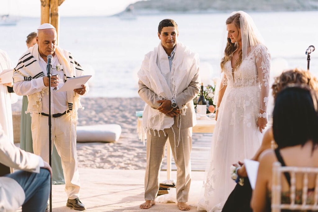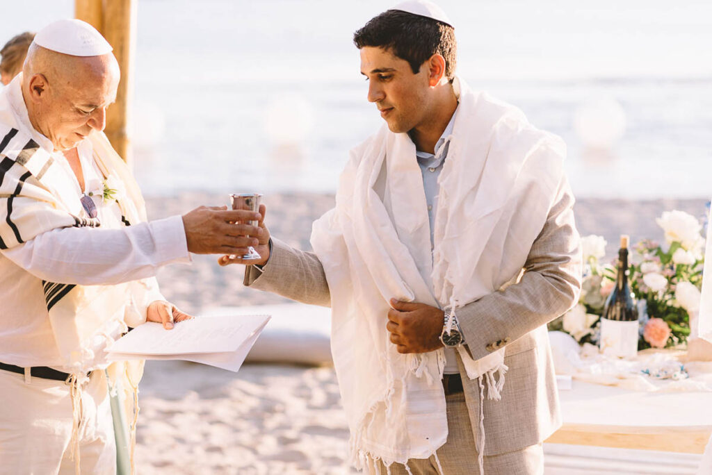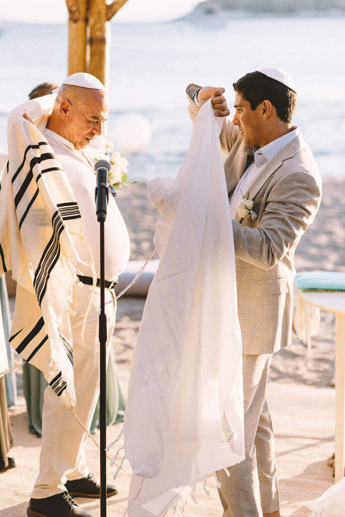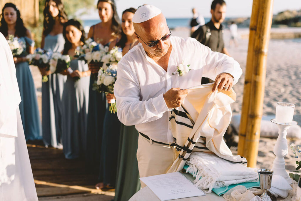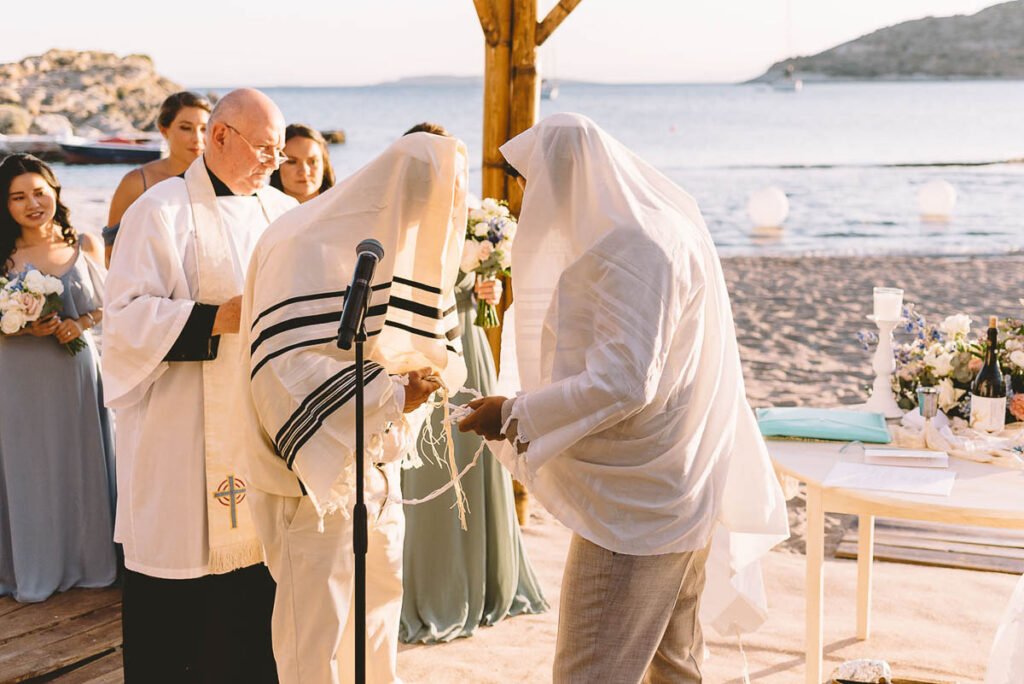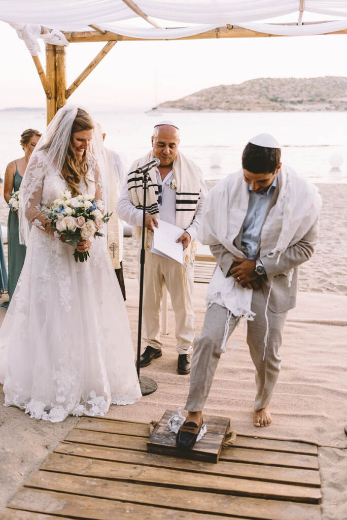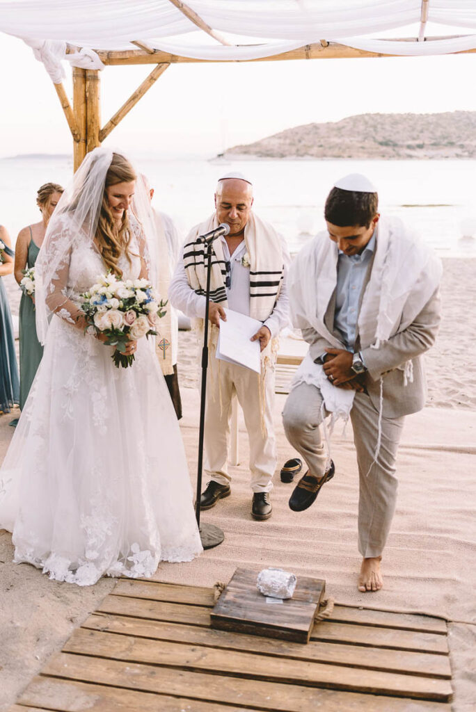 Jewish wedding traditions at a multiethnic and multireligious wedding celebration at the Athenian Riviera, honoring the groom’s religious heritage.